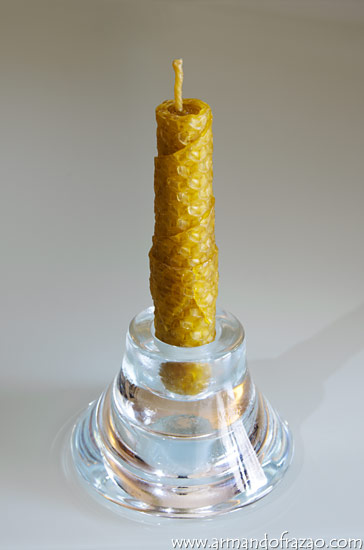 Mas existe uma alternativa muito simples para fazer velas de cera de abelhas: comprar, ou fazer, folhas de cera e simplesmente enrolá-las firmemente e de modo bem justo à volta do pavio. É um processo mais seguro, mais limpo e que, com a ajuda de uma régua, um x-acto, ou outro objecto cortante, e as nossas mãos permite uma elasticidade criativa enorme.